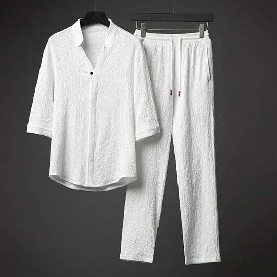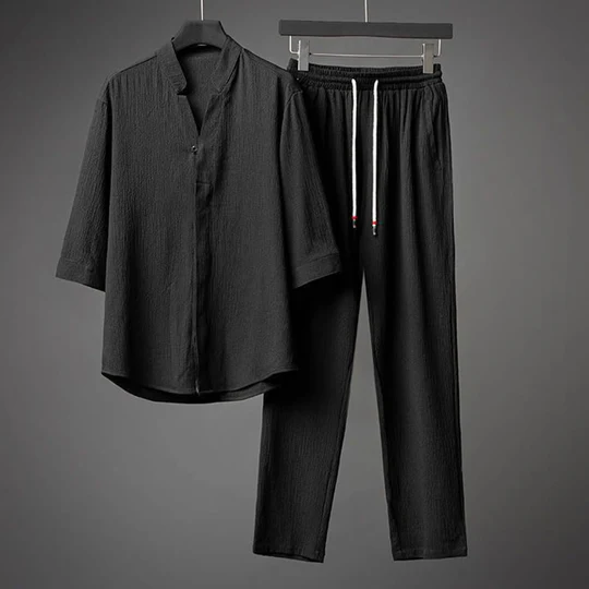 Bodhi Stones 2Pcs Solid Color Texture Button Half Sleeve Shirt Pants Men’s Set