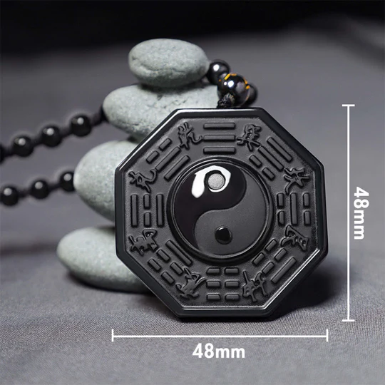 The Black Obsidian Stone Yin Yang Pendant Necklace is a piece of jewelry that features a round, black obsidian stone carved into the shape of the yin yang symbol. The pendant is attached to a silver chain and can be worn as a necklace. The yin yang symbol represents balance and harmony in Chinese philosophy.