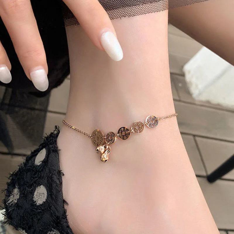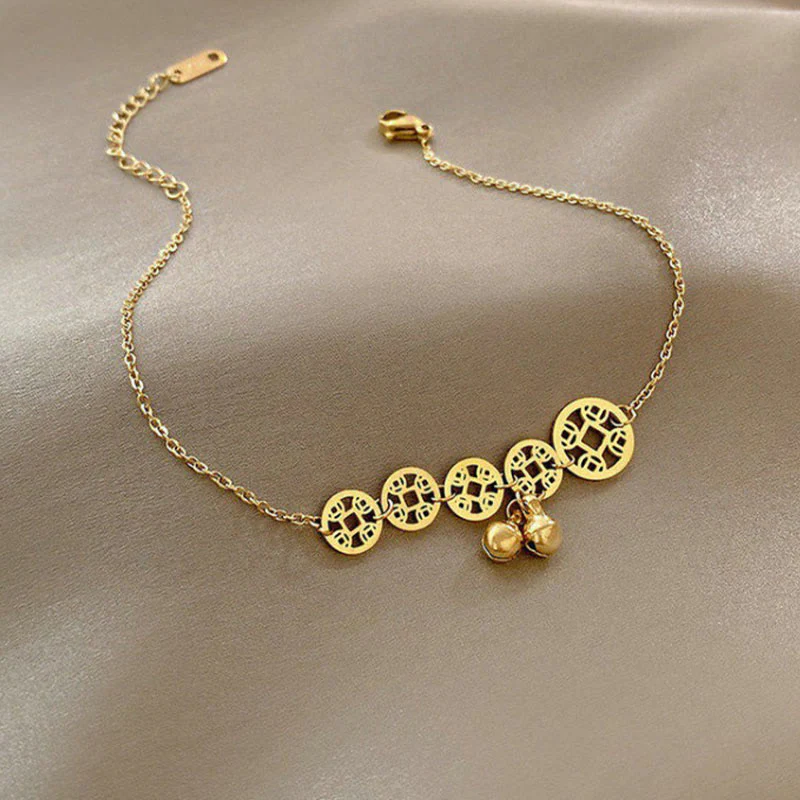 Copper Coins Bell anklet features titanium steel adorned with copper coins and a delicate bell charm. Symbolizing strength and protection, this anklet resonates with positive vibrations, warding off negativity and bringing good fortune. The soothing sound of the bell serves as a reminder to stay mindful and present, while the coins connect to prosperity and well-being.💕