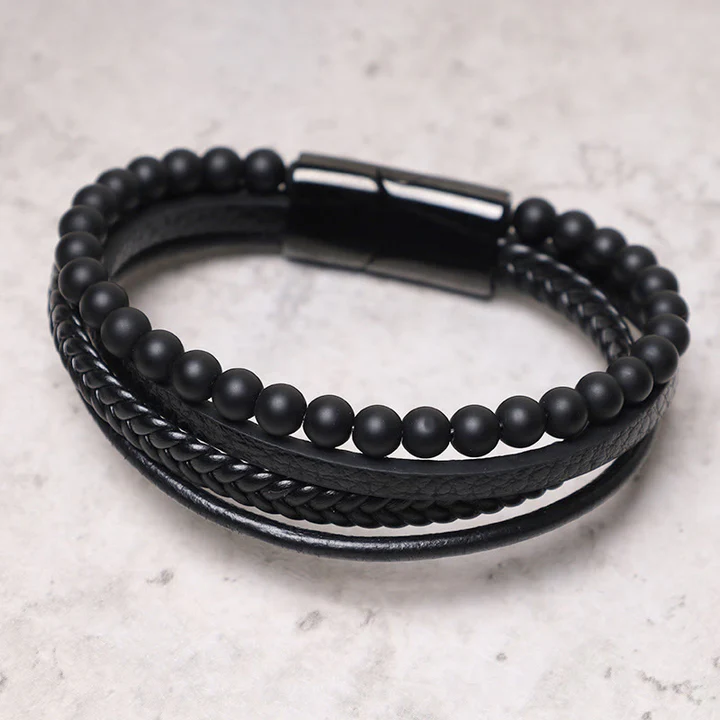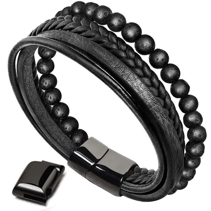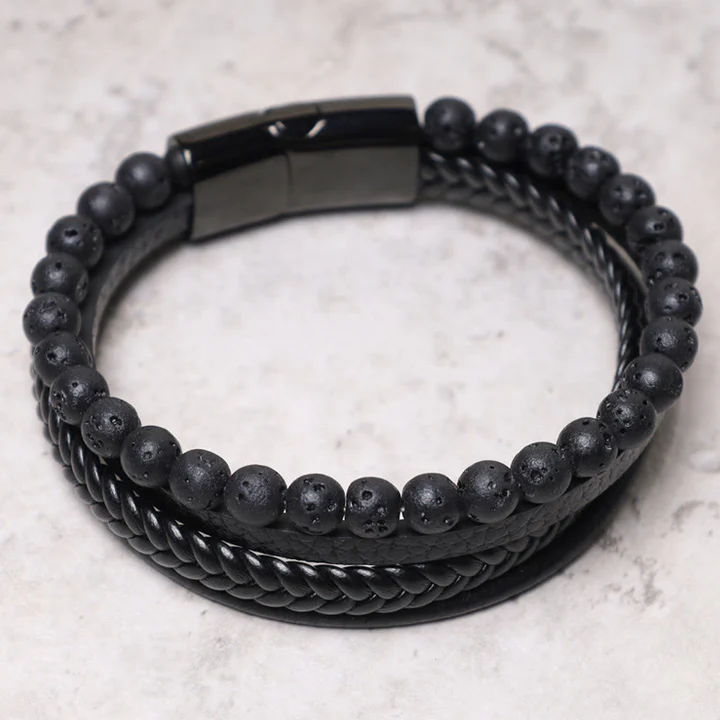 Natural Lava Rock Black Onyx Bead Leather Bracelet is a stylish and versatile accessory that complements any outfit. This handmade bracelet is made with high-quality leather and natural black onyx and lava rock beads. The black onyx promotes inner strength and focus, while the lava rock symbolizes courage and stability. The adjustable design fits most wrist sizes, making it a perfect gift for friends and family.