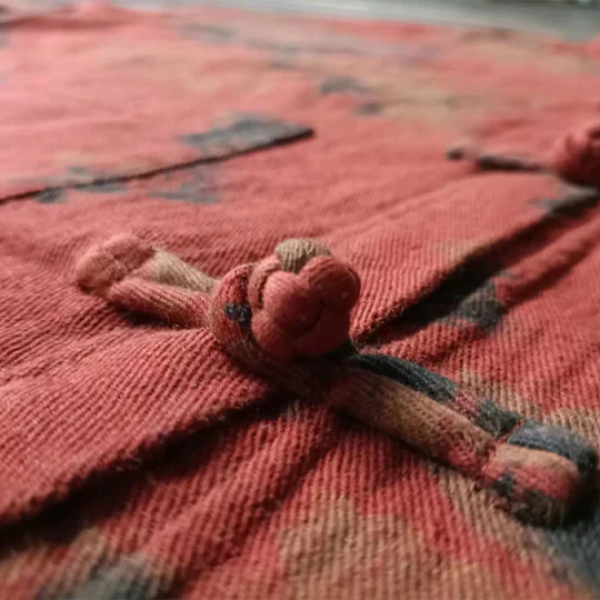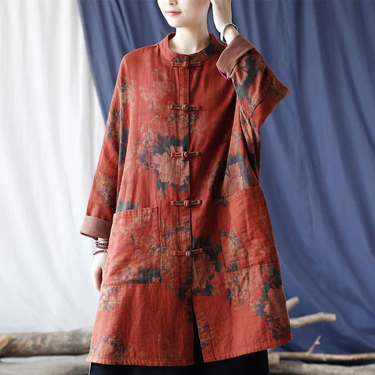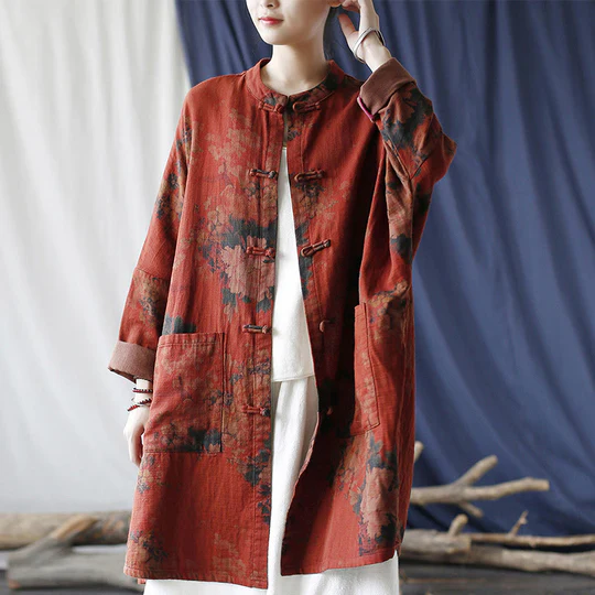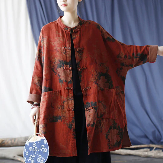 Bodhi Stones Orange Peony Flower Cotton Linen Frog-Button Open Front Jacket With Pockets