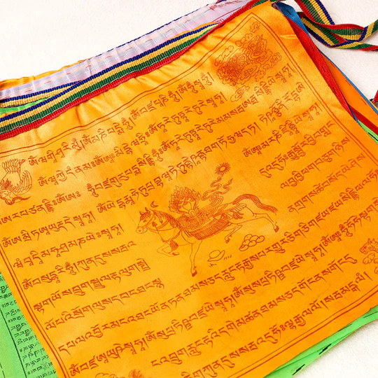 • Each flag features a large variety of prayers surrounding the center image of lungta, a Windhorse. Lungta is also the Tibetan word for ‘prayer flag’. Circulates a feeling of Harmony and increases the Spiritual Atmosphere. It Brings Spiritual Vibration carried by the wind across the house.