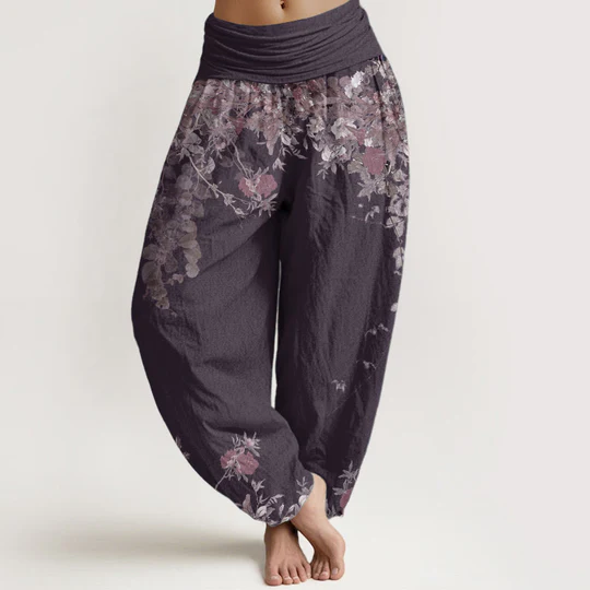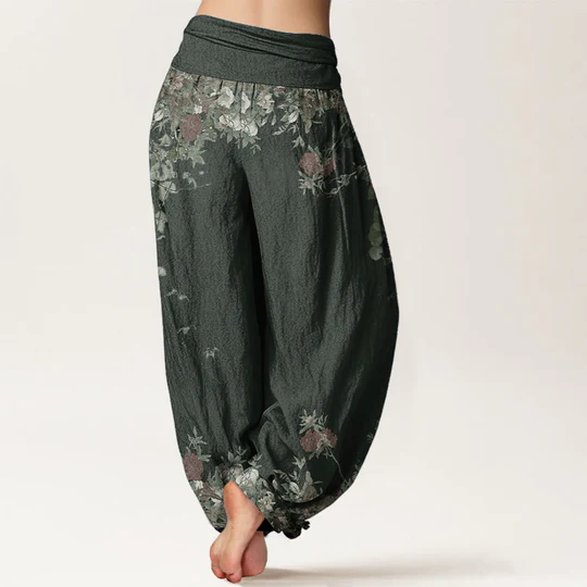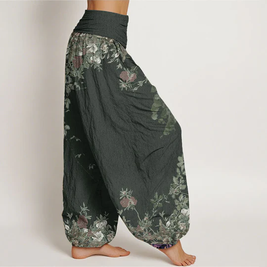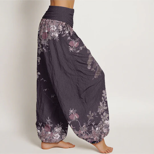 - Design: These harem pants feature a Compass and Flower print inspired by nature. The high-elastic pleated waistband offers a slimming, comfortable fit, while the loose leg design provides freedom of movement. The elastic cuffs at the ankles give a stylish look.