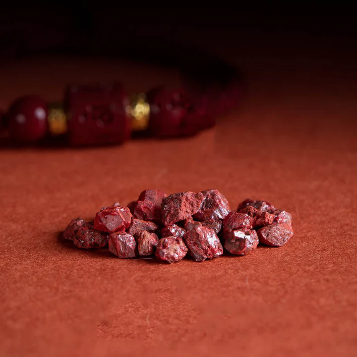 In Buddhist culture, cinnabar is often made into prayer beads and rosaries for chanting and meditation. It can bring peace of mind, improve concentration, and enhance wisdom. It is an essential auspicious item for Buddhist practitioners.