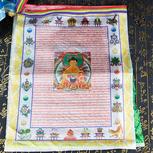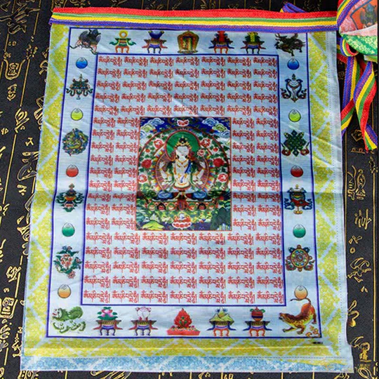 - Each flag features a large variety of prayers surrounding the center image of lungta, a Windhorse. Lungta is also the Tibetan word for ‘prayer flag’. Circulates a feeling of Harmony and increases the Spiritual Atmosphere. It Brings Spiritual Vibration carried by the wind across the house.