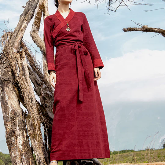 The most popular clothing is the Tibetan robe. The Tibetan robe is the most typical article of apparel for Tibetans. It is generally distinguished by a broad lapel, long sleeves, a loose waist, and a huge garment front. In addition, the Tibetan robes, pulu, silk, or other leather laces are trimmed at the collar, cuff, front edge, and bottom hem.