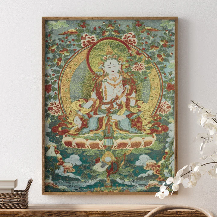 Bodhi Stones Tibetan Embroidery White Tara Thangka Tapestry Wall Hanging Wall Art Meditation for Home Decor