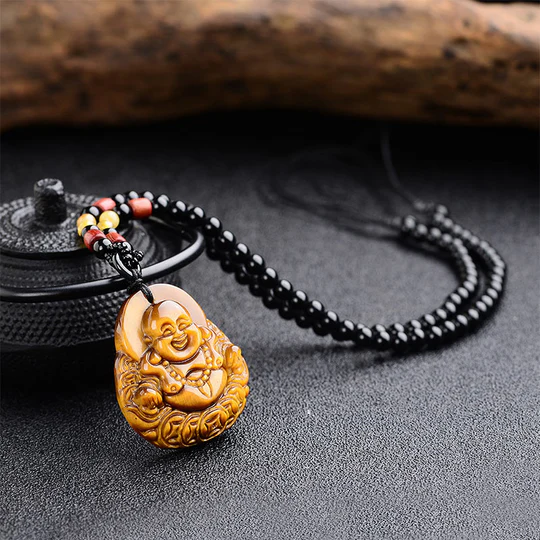 Bodhi Stones Tiger’s Eye Laughing Buddha Blessing Necklace