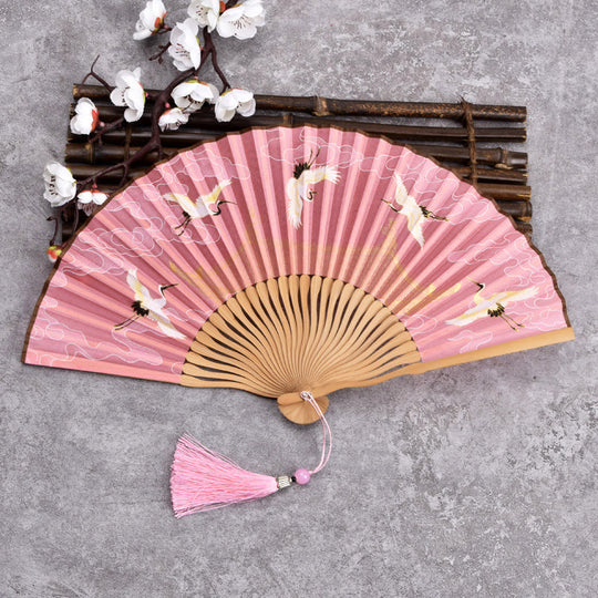 Bodhi Stones Vintage Cloud Crane Pattern Handheld Bamboo Folding Fan