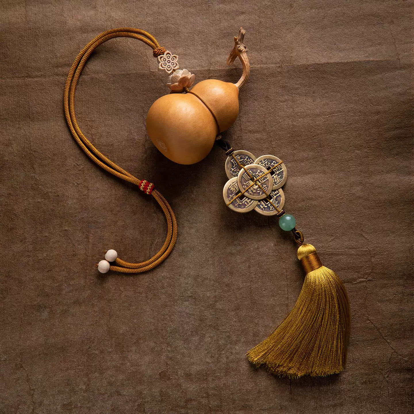 Bodhi Stones Wealth-Attracting Vitality Car Charm – Ginseng Angelica Gourd & Five Emperor Coins