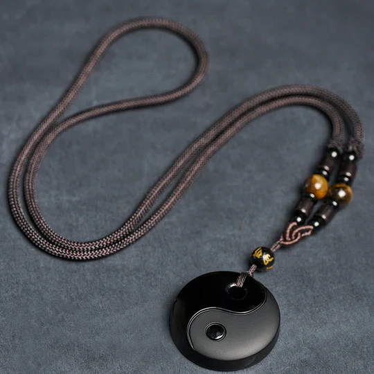 Bodhi Stones Yin Yang Symbol Om Mani Padme Hum Black Obsidian Strength Necklace Pendant